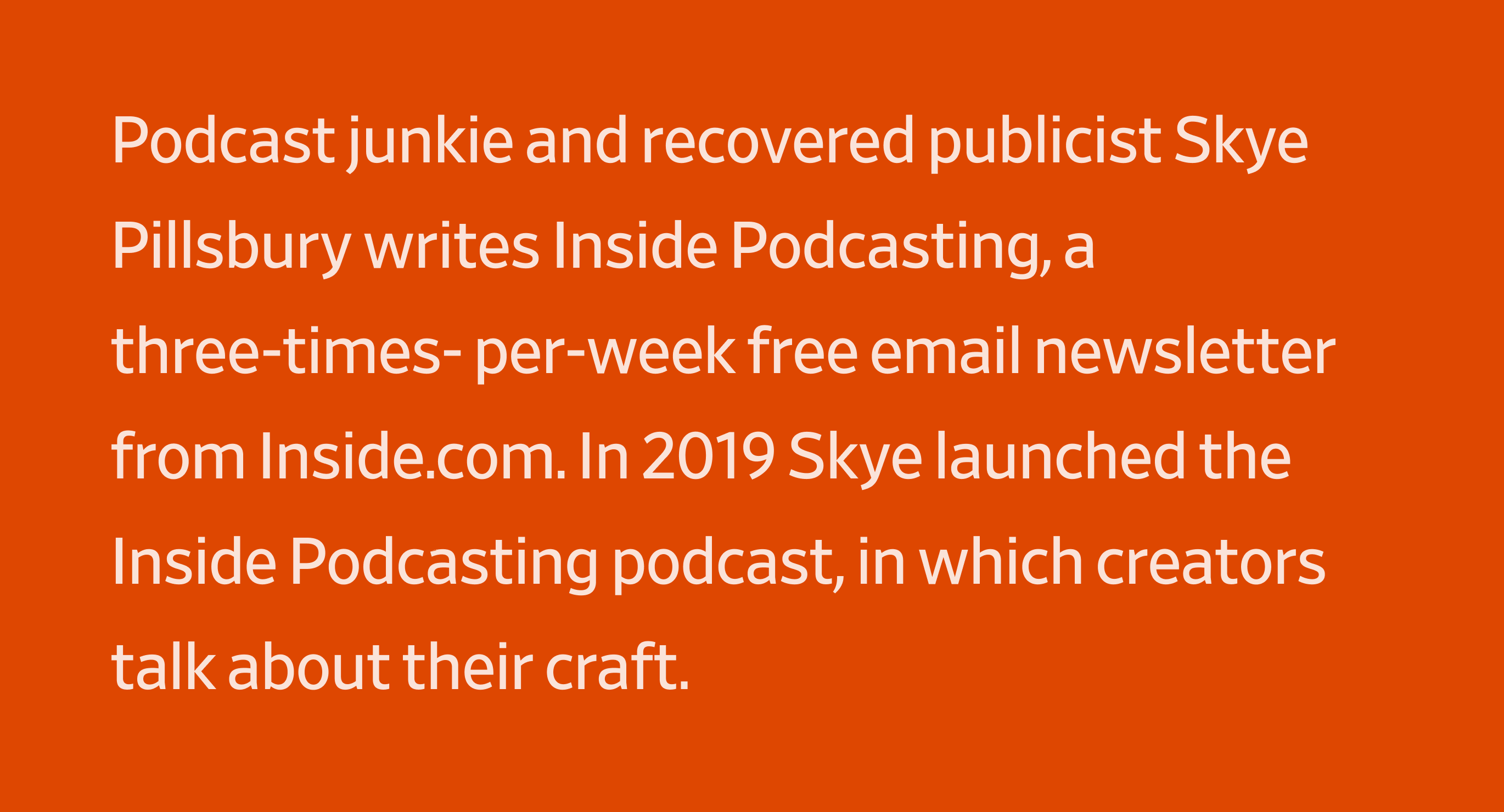 Podcast junkie and recovered publicist Skye Pillsbury writes Inside Podcasting, a three-times-per-week free email newsletter from Inside.com. In 2019 Skye launched the Inside Podcasting podcast, in which creators talk about their craft.