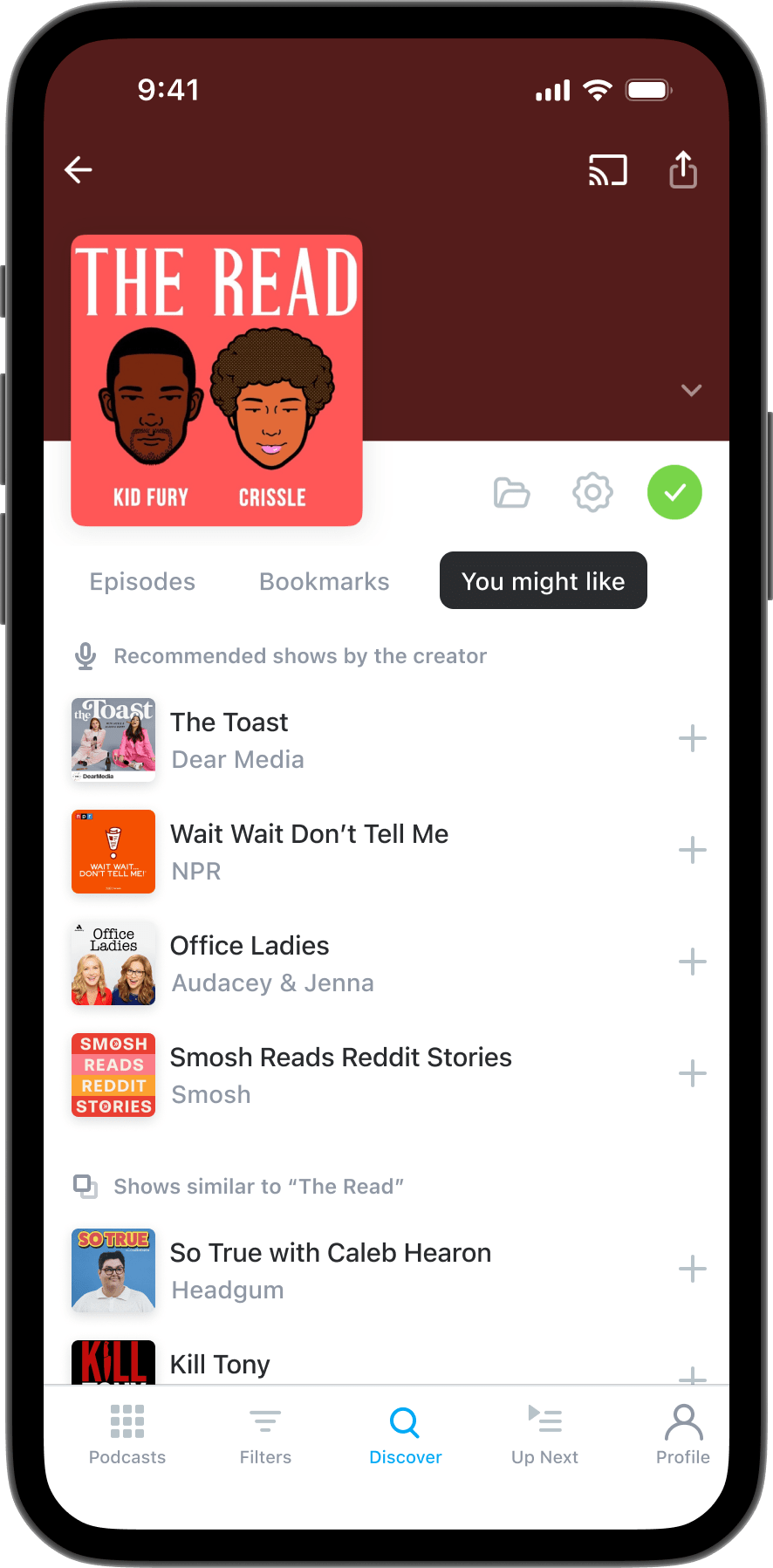 You’ll now find Recommendations on each podcast’s page – just head to the You Might Like tab (next to Bookmarks) to explore shows similar to the one you’re currently viewing.