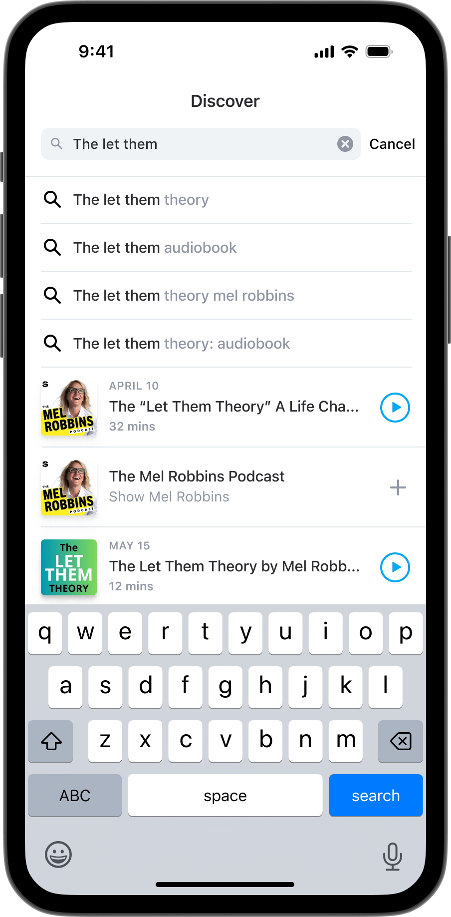 When you tap on the Search bar on the Podcasts or Discover tabs, you’ll automatically get access to the new search. Start typing, and predictive suggestions will appear as you go. Pick one of the suggestions, or just hit Enter, and you’ll be taken to the new results layout where you can explore and start listening right away.
